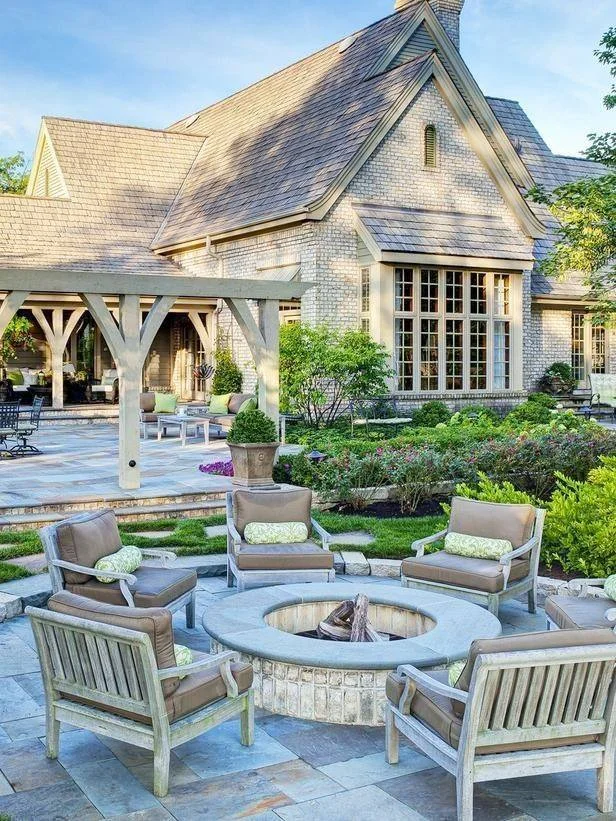 A traditionally suburban home with a charming, rustic feel and homely atmosphere will never go out of style. To complement a home like this, consider constructing a towering fireplace that provides enough light and warmth to permeate your entire outdoor living area. Surround the fireplace with a selection of comfortable armchairs and sofas, creating a hotspot for both conversation and quiet relaxation. Cozy furniture arrangements like these bring family and friends together, facilitating the creation of unforgettable memories.